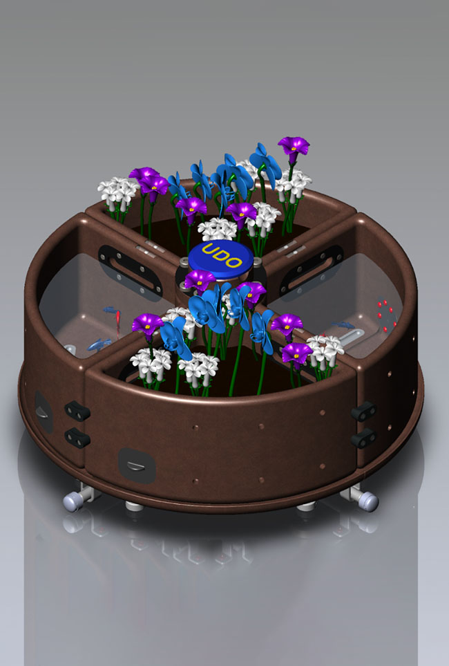 But the versatility doesn't stop there. Phase 1 introduces the concept of modularity, with the ability to arrange NC#1 as a 1-piece, 2-piece, 3-piece, or 4-piece radial wedge formation. These wedges encircle a central Hydration/Fertilization pole and rest atop modular drip-plates, ensuring proper care for your plants or aquatic life. For those looking to automate their watering, water supply pipes can be seamlessly integrated into this ideal expandable planter box system.